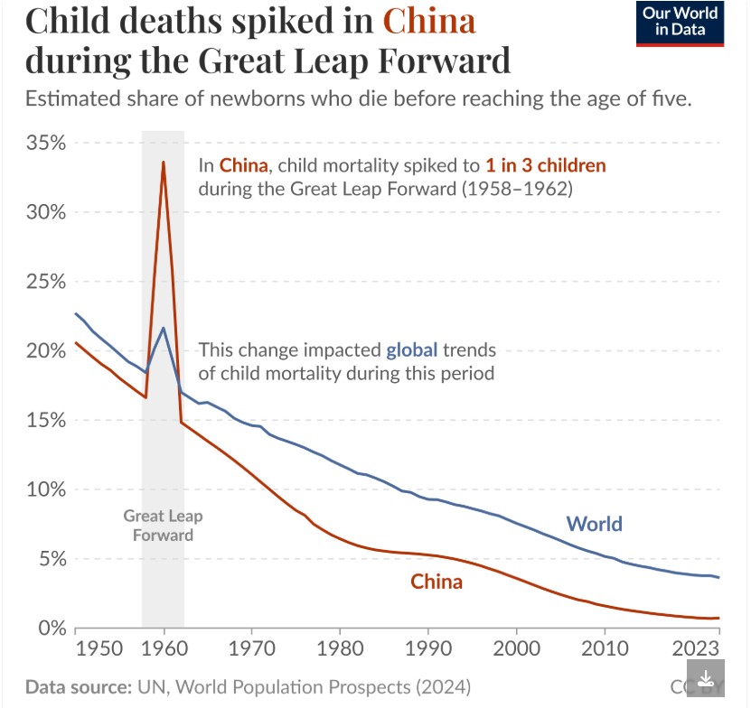 Los efectos menos conocidos del maoísmo. Las tasas de mortalidad infantil en China han descendido de más del 20 % en 1950 a menos del 1 % en la actualidad. Sin embargo, este progreso constante se vio interrumpido a finales de la década de 1950 durante el Gran Salto Adelante. Se trataba del plan nacional de China para industrializarse rápidamente, pero provocó una hambruna generalizada y una crisis económica. Como muestra el gráfico, las tasas de mortalidad infantil se dispararon en China durante este periodo, llegando a morir hasta uno de cada tres niños antes de cumplir los cinco años. Este cambio fue tan drástico que influyó en la tendencia mundial.
